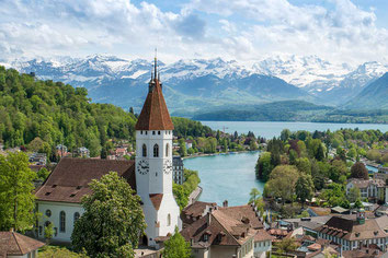 Interlaken lies between the deep blue waters of Lake Thun and the turquoise waters of Lake Brienz.