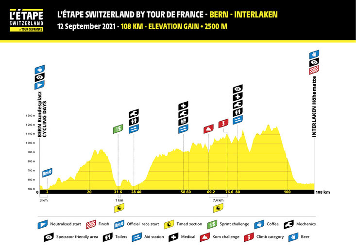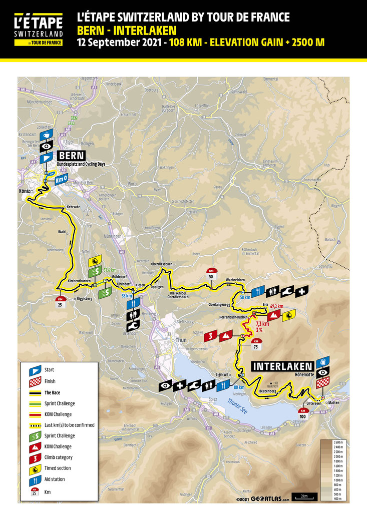 On the almost 110 km long route from Bern to Interlaken, escorted by police and entourage, you will feel like a real pro. The race starts on the Bundesplatz in Bern, directly in front of the Bundeshaus. The route takes you through the UNESCO WORLD CULTURAL HERITAGE of the old town of Bern, over the Längenberg with a view at the impressive 4000m peaks of the Bernese Oberland in the direction of Emmental to the picturesque Eriz. Here, the ascent towards Sigriswil awaits you, rewarded with the magnificent sight over Lake Thun lying far below you. The last of the 2,500 meters of ascent will take you through a unique mountain landscape to Beatenberg - enjoy the impressive panorama with the world-famous mountains Eiger, Mönch and Jungfrau. Then ride down to Interlaken and mobilize your last energies as you turn onto the final meters of the race and cross the finish line along the world-famous Höhematte.
